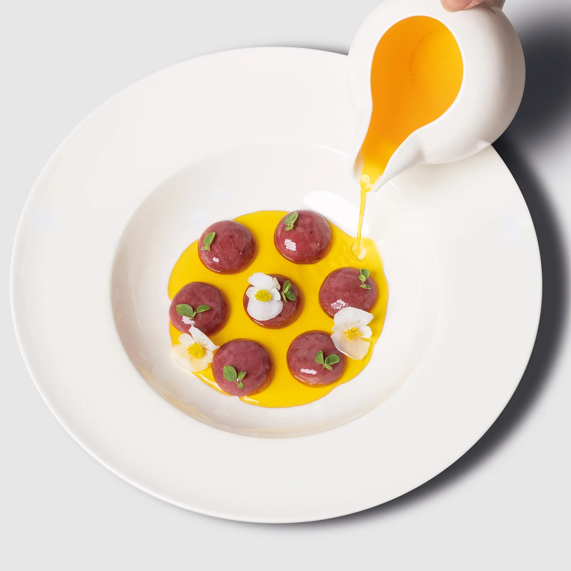 Grazia Bua - Bottoni viola di carne, maggiorana, fiori eduli e brodo di zafferano.